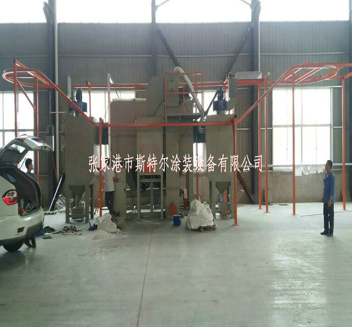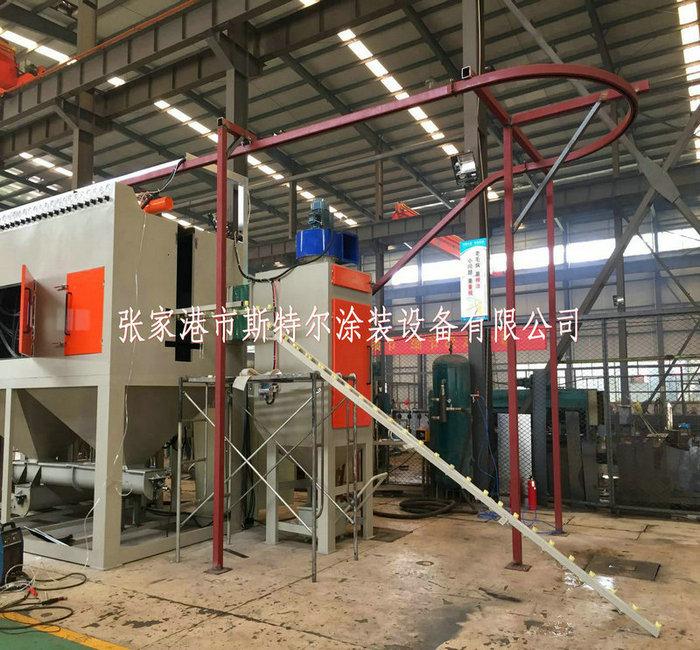 從外型結構上來來說,吊鉤式自動噴砂機可以分為懸掛鏈式吊鉤噴砂機和電動葫蘆式吊鉤噴砂機,吊鉤是自動噴砂機 的組成部分有吊具系統一套,噴砂主機箱體一套, 噴砂系統一套,砂料回收系統及分離系統一套,電控系統一套,除塵系統一套。其中吊具系統是根據客戶的產品來選定的,它可以分為電動葫蘆式吊具系統和懸掛鏈吊具系統,噴砂主箱體為噴砂進行的空間,在噴砂主箱體內設置了根據客戶要求配置的噴砂槍,比如說12把,16把,24把等,每把槍都可以單獨控制。在噴砂進行的同時,砂料也通過回收管道回收到旋風分離器處,通過旋風分離系統,把砂塵分開,砂料會自動落回儲料倉內循環使用,粉塵會被抽進除塵箱內,除塵箱一般根據工作艙尺寸和噴槍數量,來選擇除塵箱濾筒數量及功率。工人在噴砂作業結束時,可以按設備控制面板上的脈沖除塵按鈕,定期清理除塵箱及清理集成箱內的灰塵。 該套設備的控制系統一般有風機啟動,風機停止,每把噴槍的單獨控制按鈕,照明開關,吊鉤正反轉控制鈕,吊鉤進出控制按鈕,時間控制系統,吊鉤轉速控制系統,脈沖除塵按鈕等,當控制比較復雜的時候,還可以做成plc控制系統。整套設備都可以根據客戶的需求進行定制。